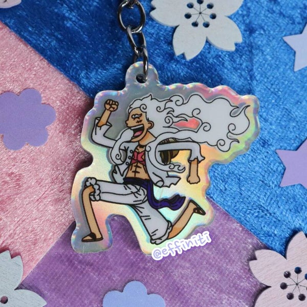 Watch as the "Sun God" transformation comes to life with the holographic effect, creating a stunning effect that changes as you move the keychain.The holographic acrylic adds a mesmerizing touch, making it a special item in your anime merch collection.