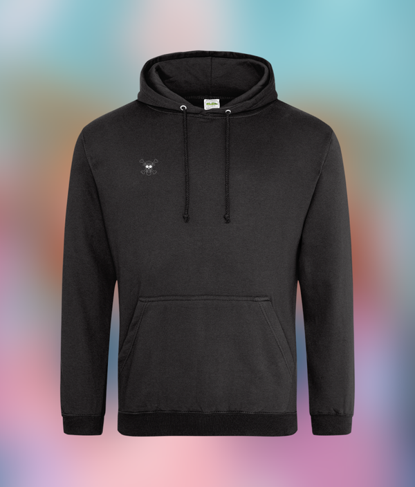 On the back of our anime hoodie, we have a silhouette of the Sun God! On the left sleeve, there's the text 'Sun God Nika' in Japanese. On the front of the hoodie, on the right side, we have a straw hat skull logo!