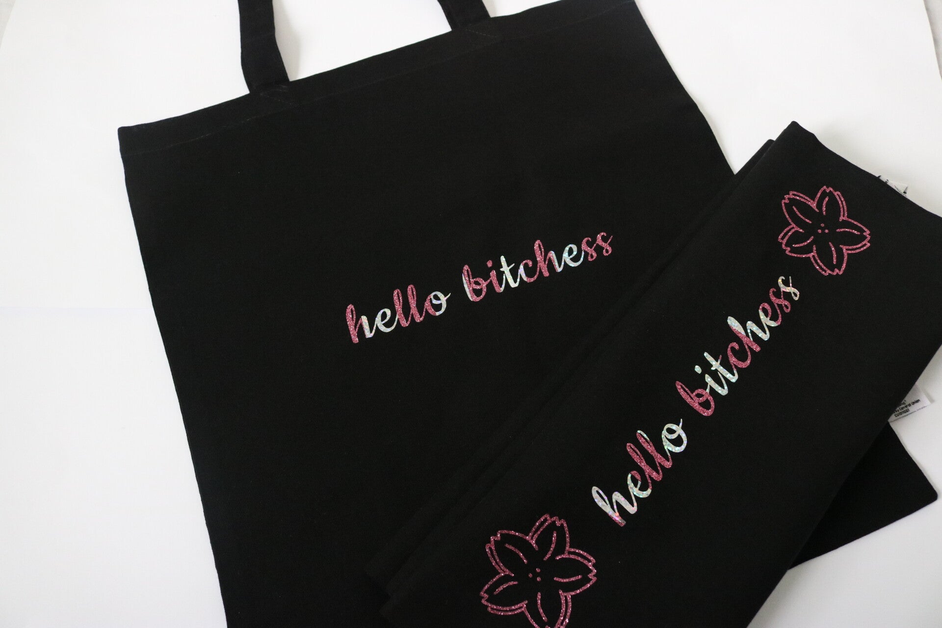 Hello Bitchess! but in a different color! One of our favorite greetings or catch phrases to say to our friends! Do you also want to greet your friends like this!? Then put this cute totebag with the text ''Hello bitchess'' in a holographic gray color and a glitter pink color in your cart!